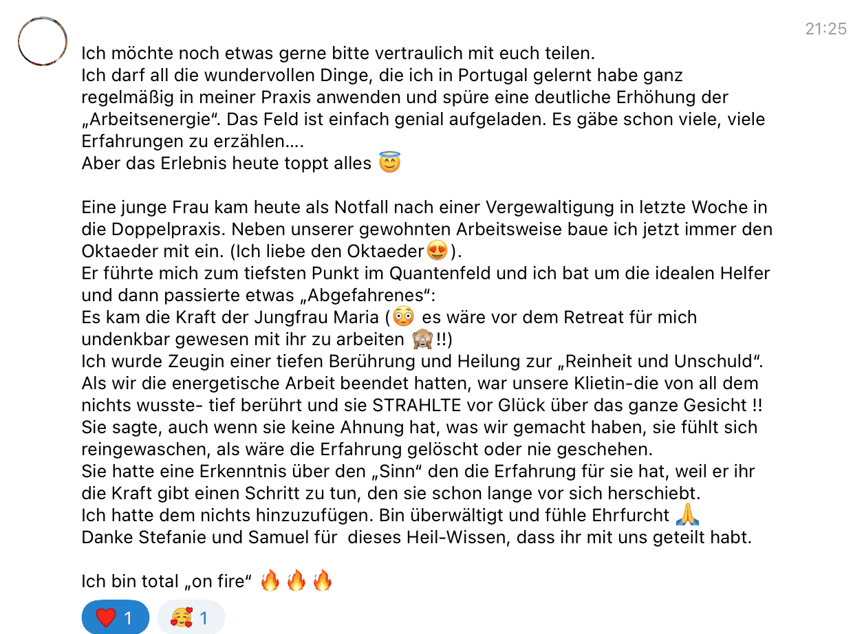 dass ich durch euch mein Vertrauen in meine Heilerinfähigkeit wieder erlangt habe und sie wieder erwecken konnte. Knüpfe nun wieder an das an, was ich vor paar Jahren aufgegeben hatte 🙏